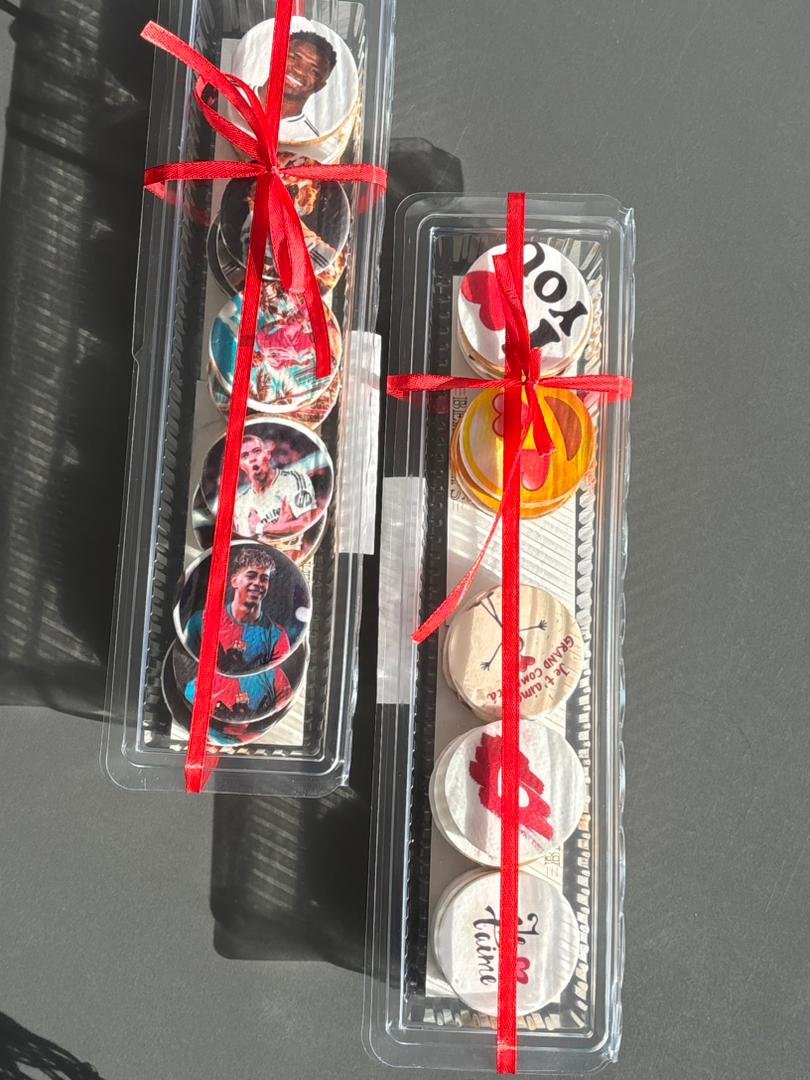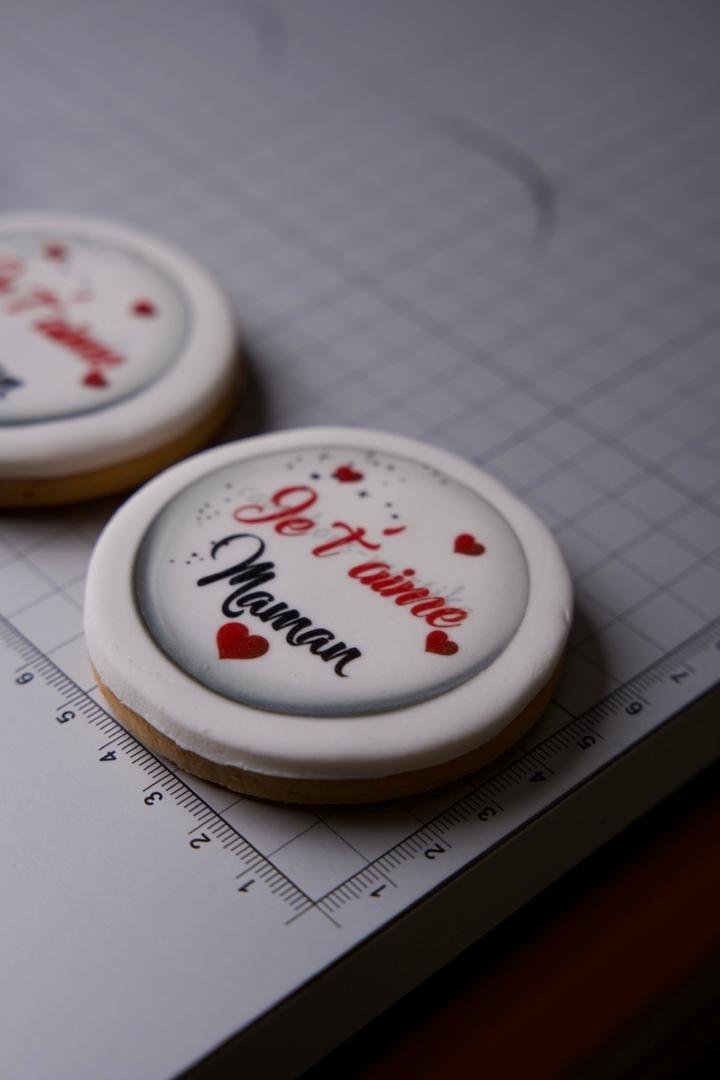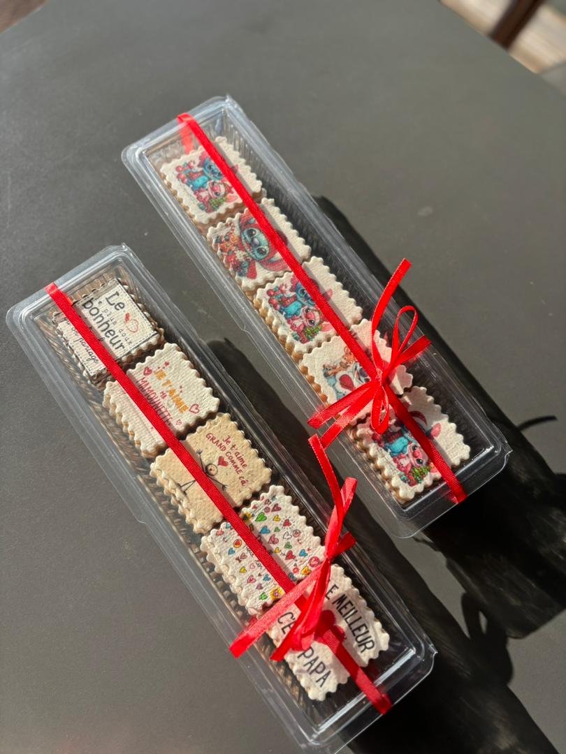 Photos, prénoms, messages ou logos imprimés directement sur chocolat, gâteaux, entremets, café, sablés et plus encore, avec des encres alimentaires certifiées.